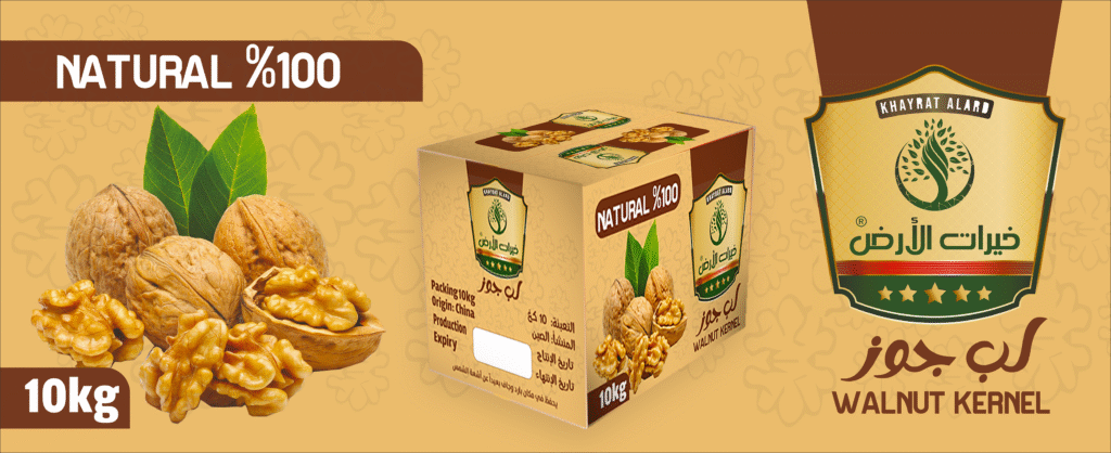 - 📦 التغليف المميز: توفر الشركة طردًا يحتوي على 1 كيلوغرام من لب الجوز الطبيعي %100، جاهز للتوزيع المحلي والعالمي.